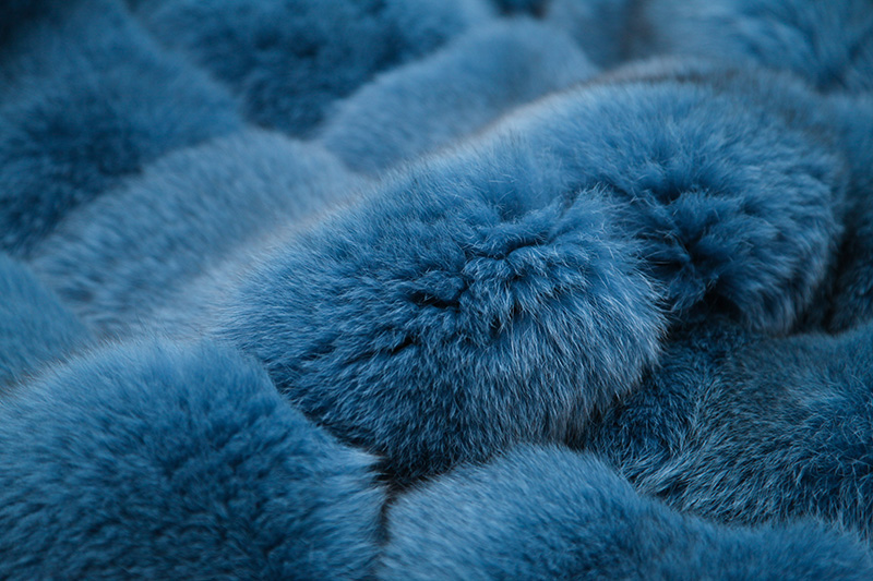 Fox fur coat, made of sumptuous and luxurious Fox fur, soft and dense. Stand collar with long sleeves design. Dyed blue color. Real leather conjoined.