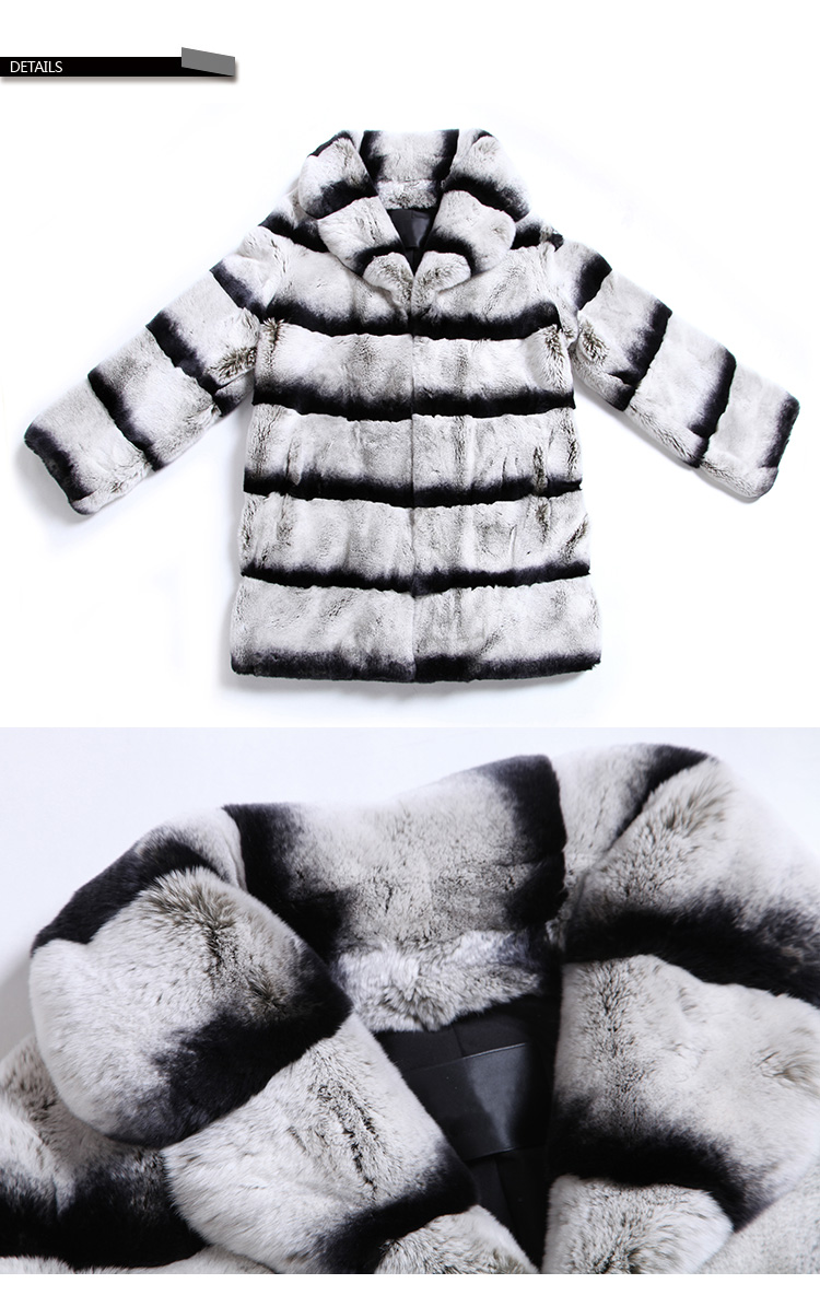 Women's Rex Rabbit fur jacket, made of ultra-soft Rex-Rabbit fur. Dyed inyo Chinchilla fur look, with striped gradient color. Notched shawl lapel.